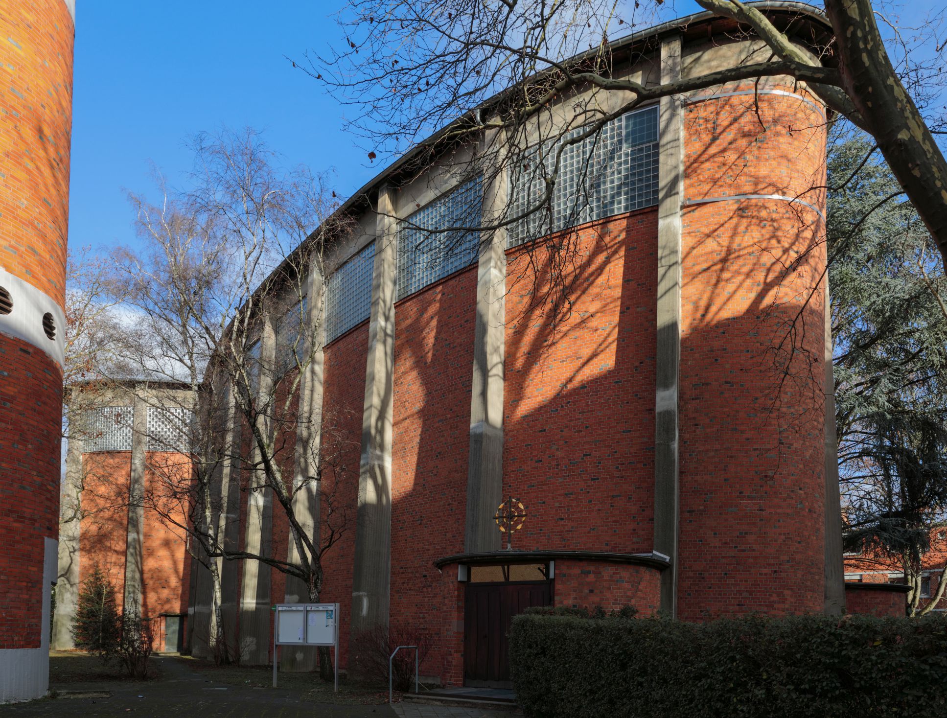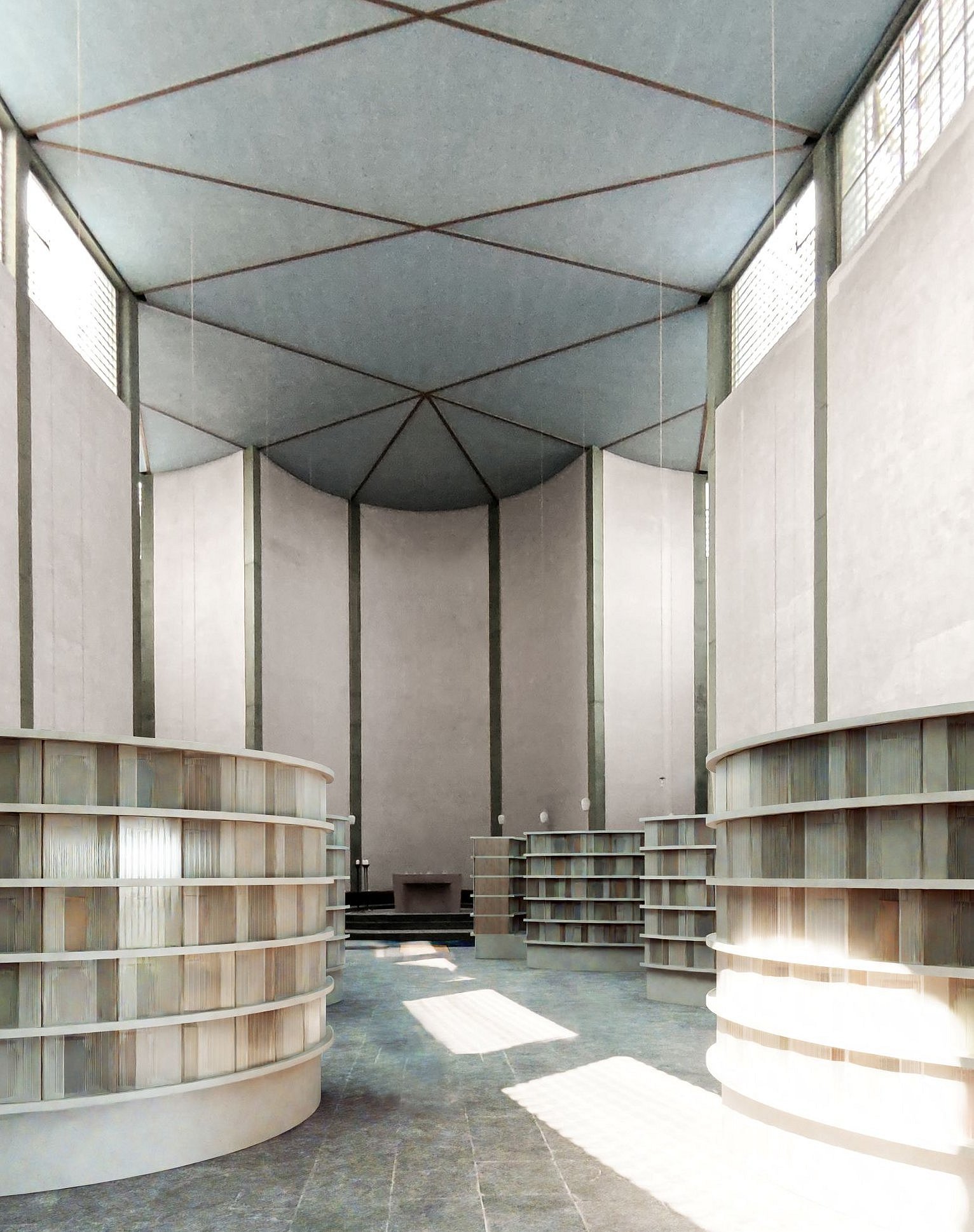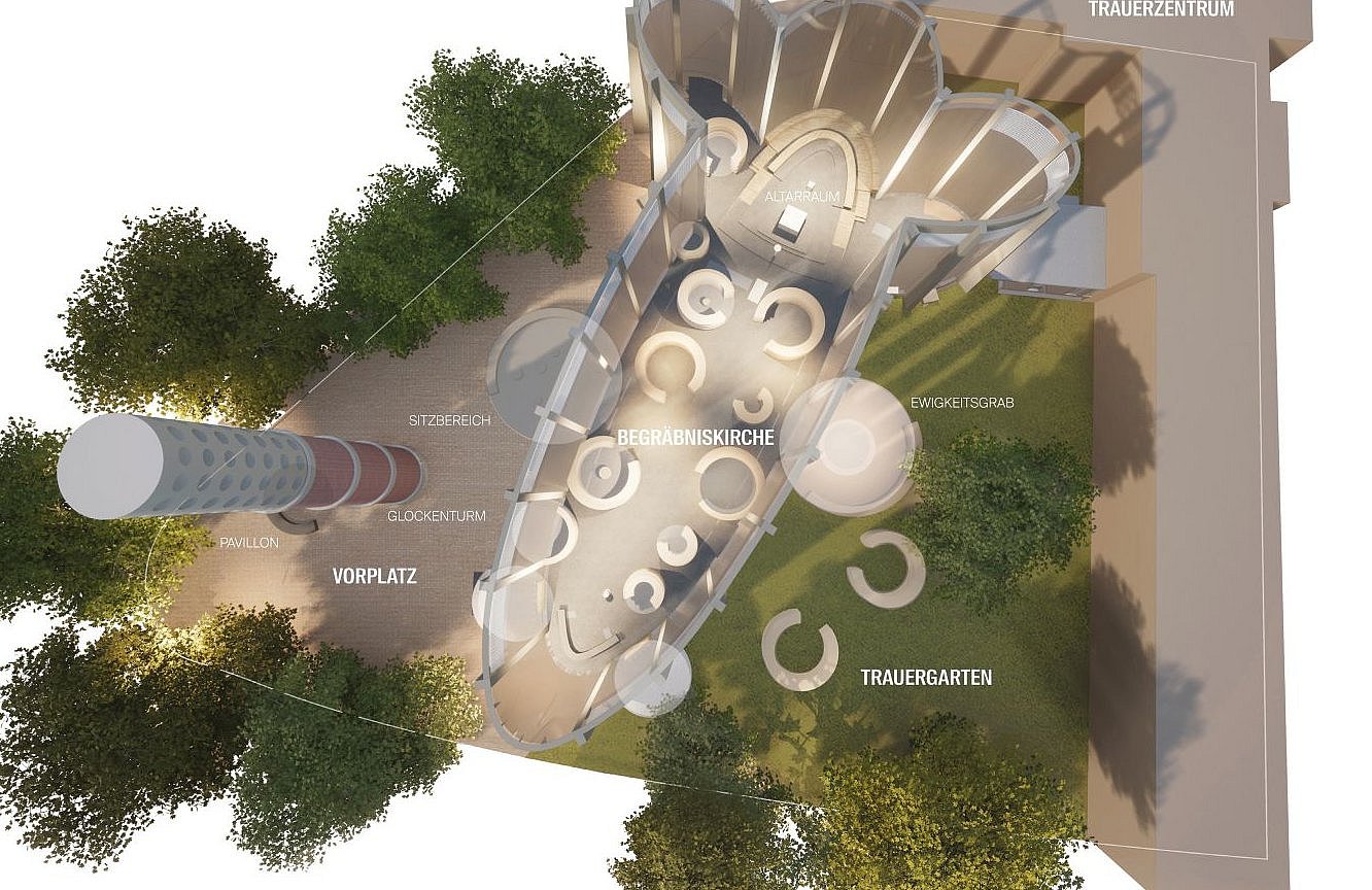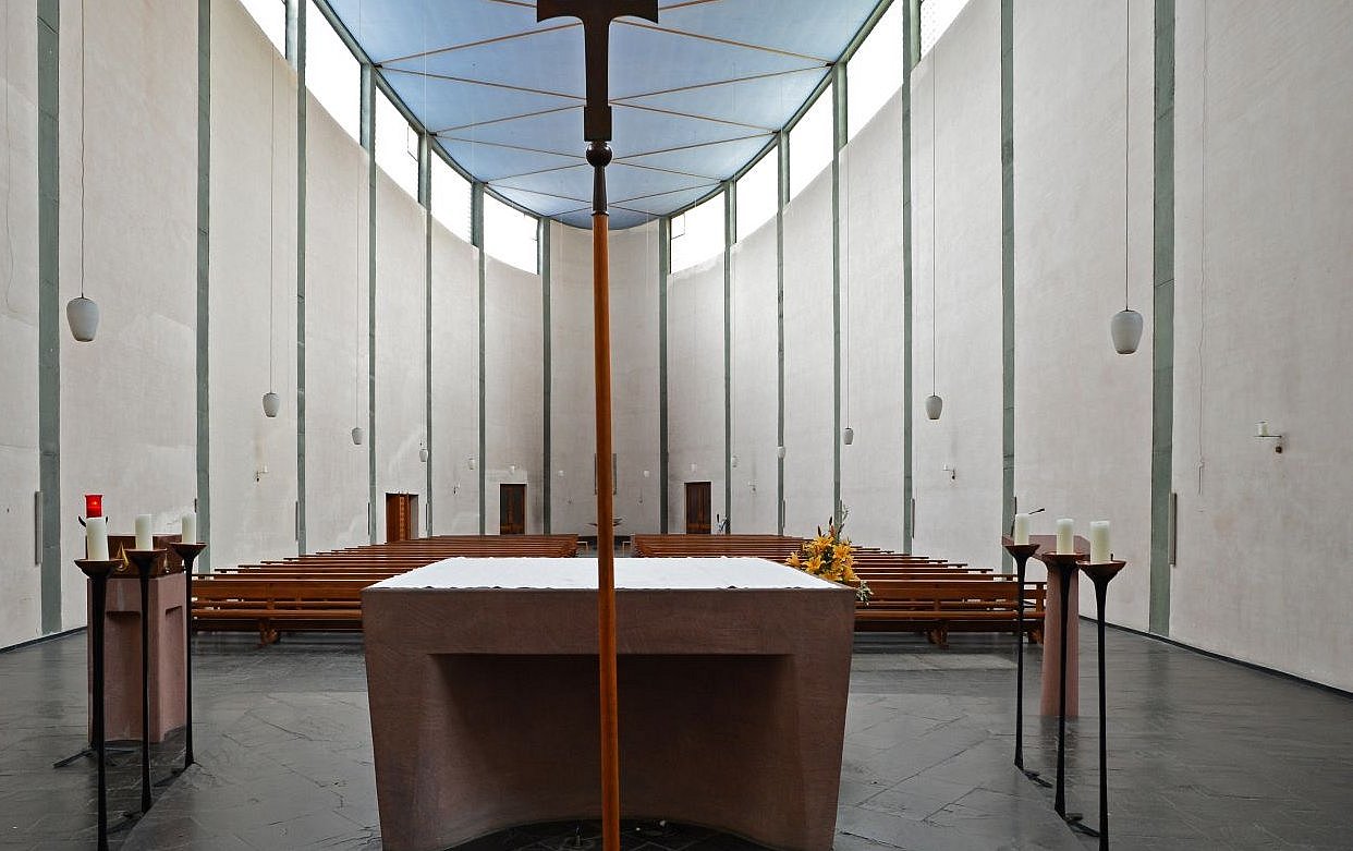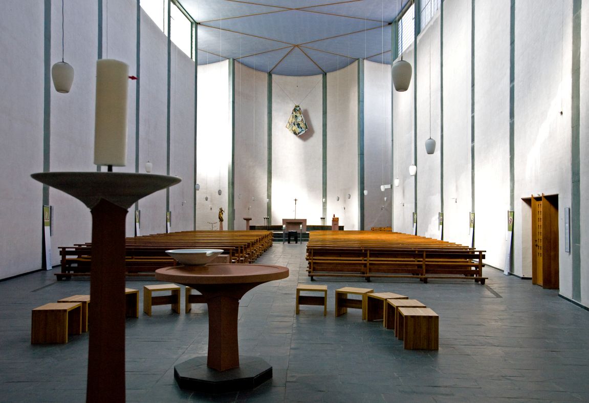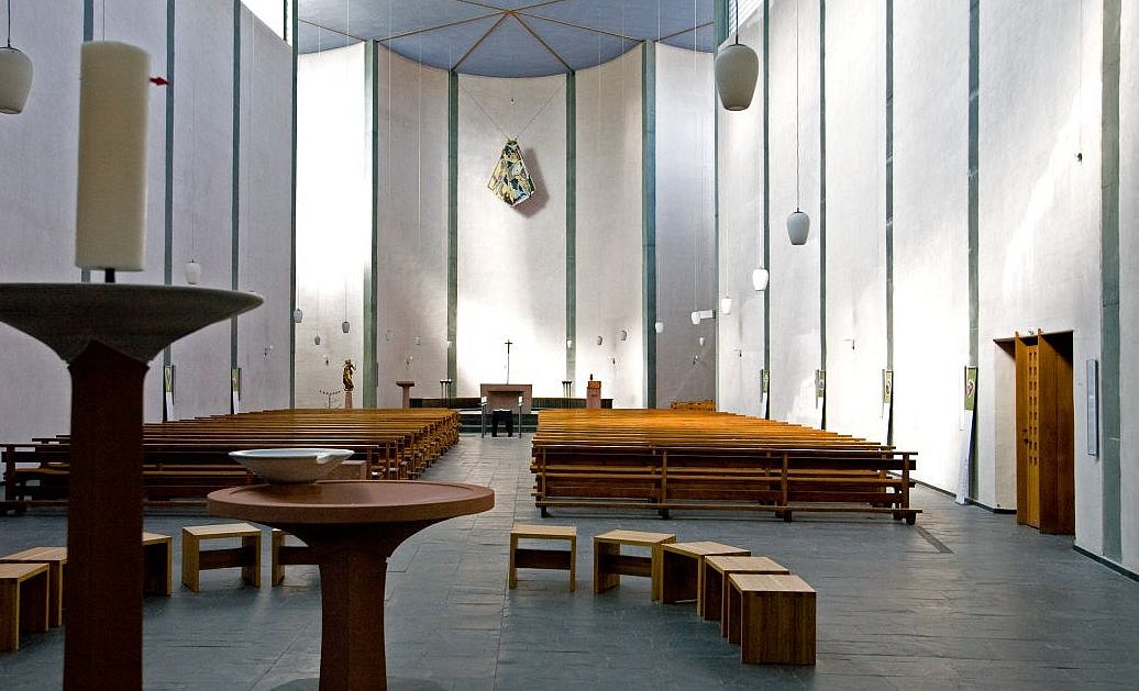 Die Architektinnen haben sich dafür entschieden, die Begräbniswände als offene Kreise zu gestalten – und auf diese Weise kleinere Bereiche im 13 Meter hohen Kirchraum zu schaffen, die sich intimer und geschützt anfühlen. Hier soll Raum für Trauer sein, Raum für Rückzug und Zwiesprache, für Gebet. „Momente der Geborgenheit“ formulieren es die Architektinnen. An anderer Stelle im Konzept ist die Rede davon, dass die „gebogenen Raumkörper die Trauernden schützend zu umarmen scheinen“ – ein klassisches Motiv des Architekten Rudolf Schwarz, das er in einer Reihe seiner Kirchen verwirklichte.