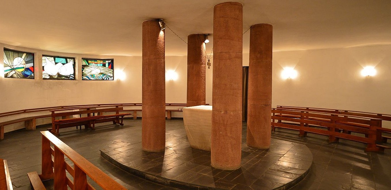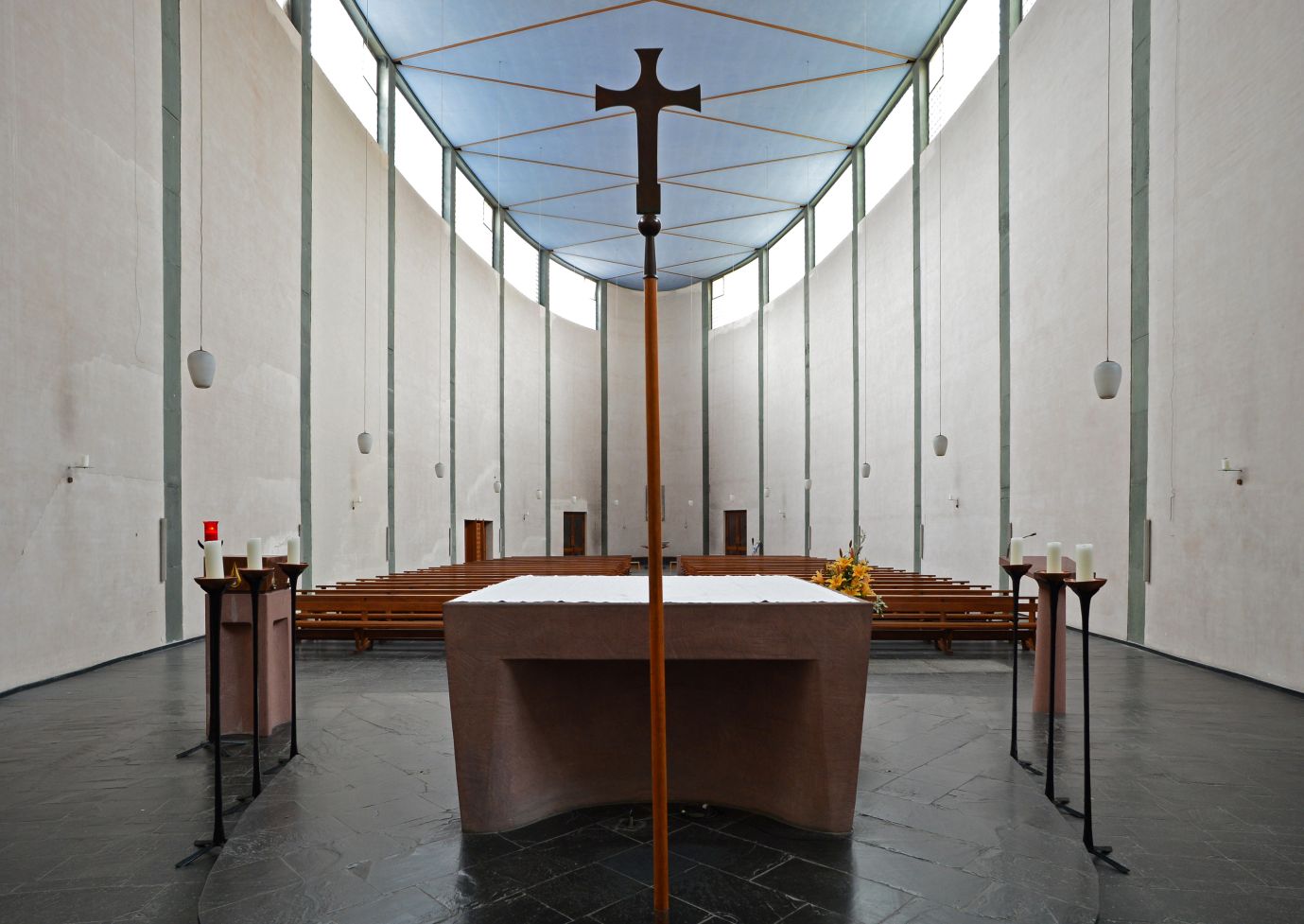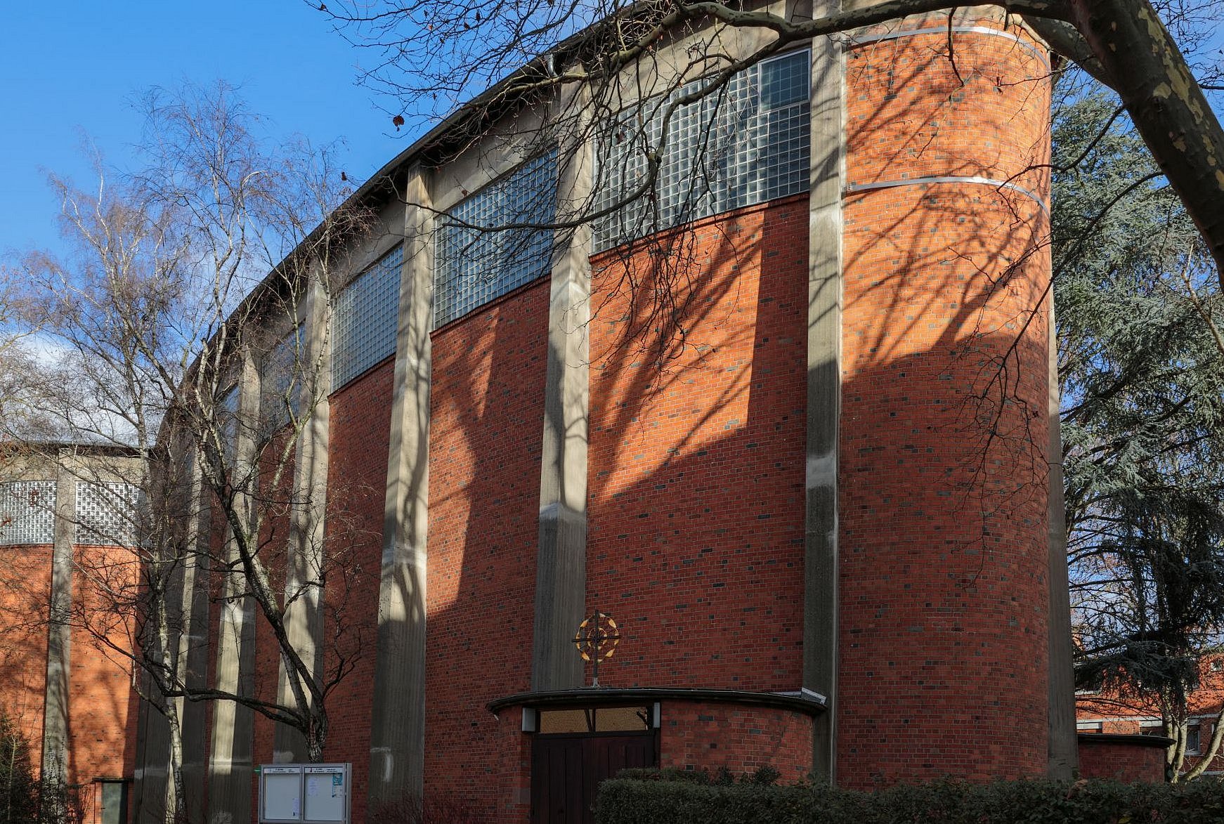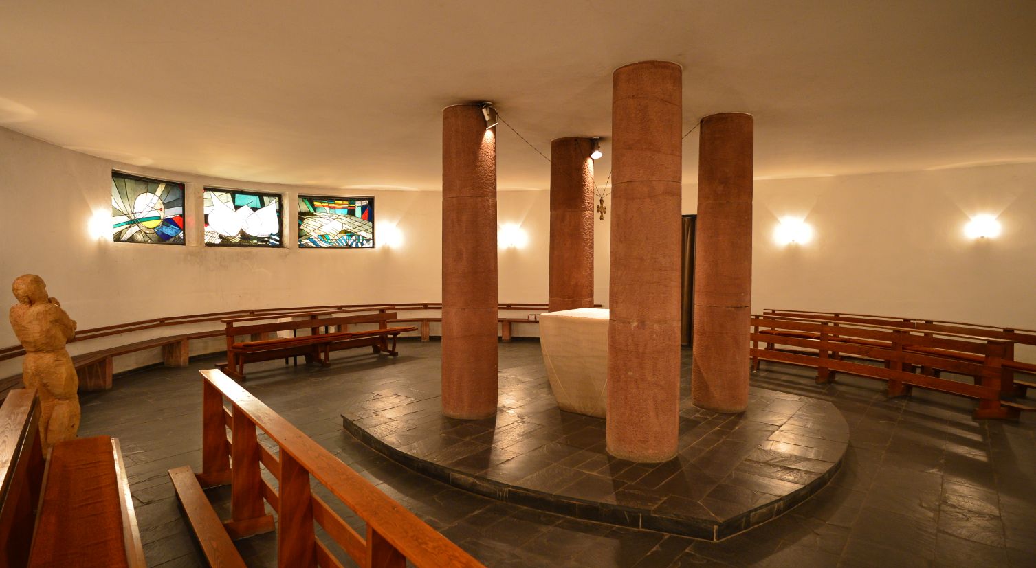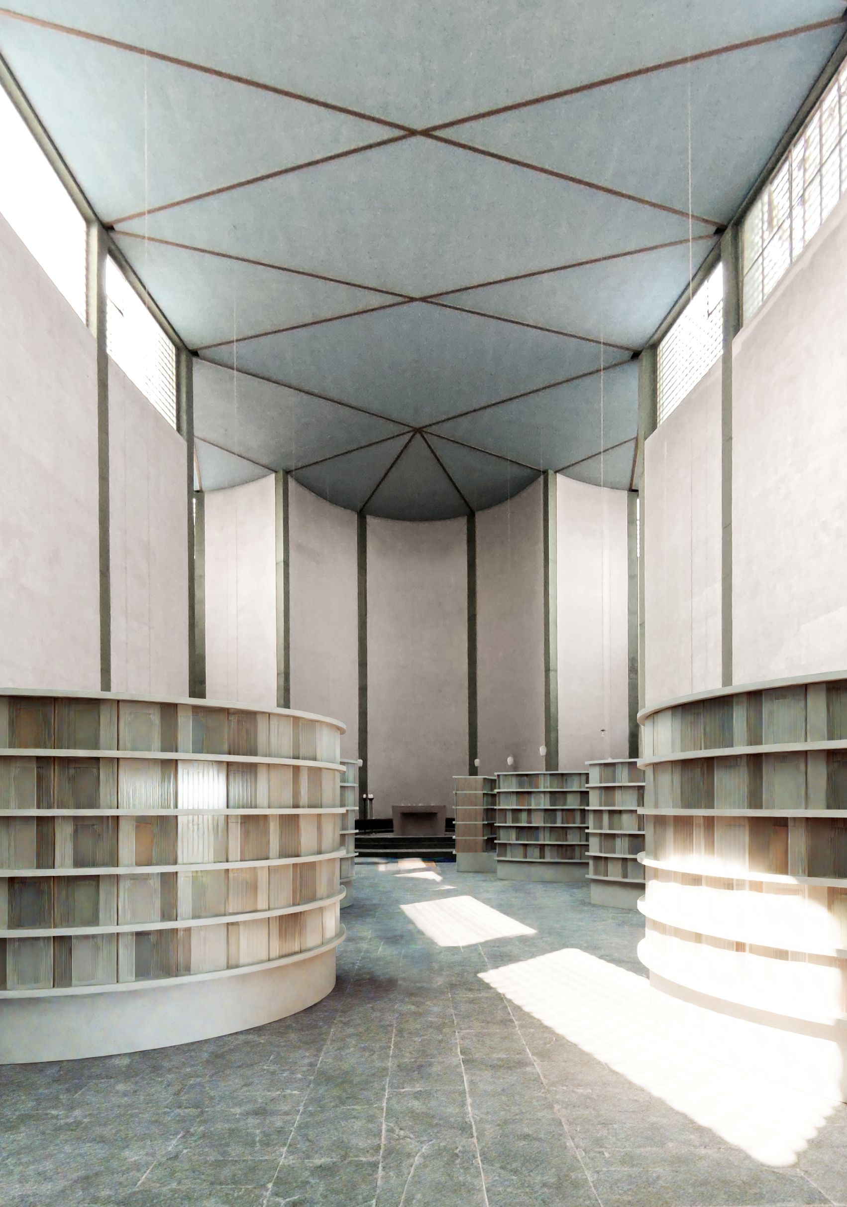 Die Architektinnen haben sich dafür entschieden, die Begräbniswände als offene Kreise zu gestalten – und auf diese Weise kleinere Bereiche im 13 Meter hohen Kirchraum zu schaffen, die sich intimer und geschützt anfühlen. Hier soll Raum für Trauer sein, Raum für Rückzug und Zwiesprache, für Gebet. „Momente der Geborgenheit“ formulieren es die Architektinnen. An anderer Stelle im Konzept ist die Rede davon, dass die „gebogenen Raumkörper die Trauernden schützend zu umarmen scheinen“ – ein klassisches Motiv des Architekten Rudolf Schwarz, das er in einer Reihe seiner Kirchen verwirklichte.