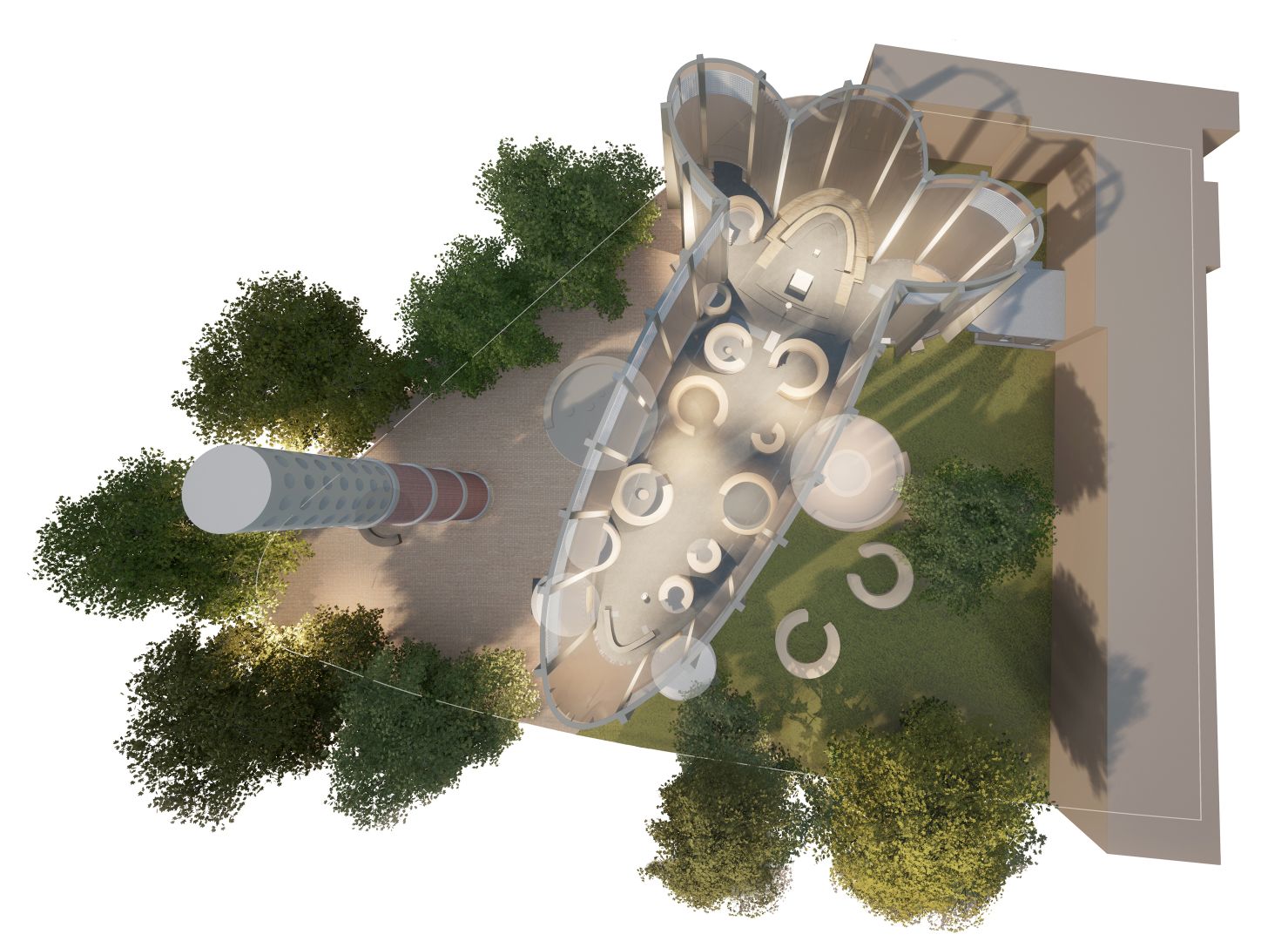 Zusätzlich zum Inneren der Kirche werden der Vorplatz und der Kirchgarten in das architektonische Konzept mit einbezogen, dort entstehen unter anderem Sitzbereiche und in einem späteren Bauabschnitt bei Bedarf weitere kreisförmige Urnenwände.